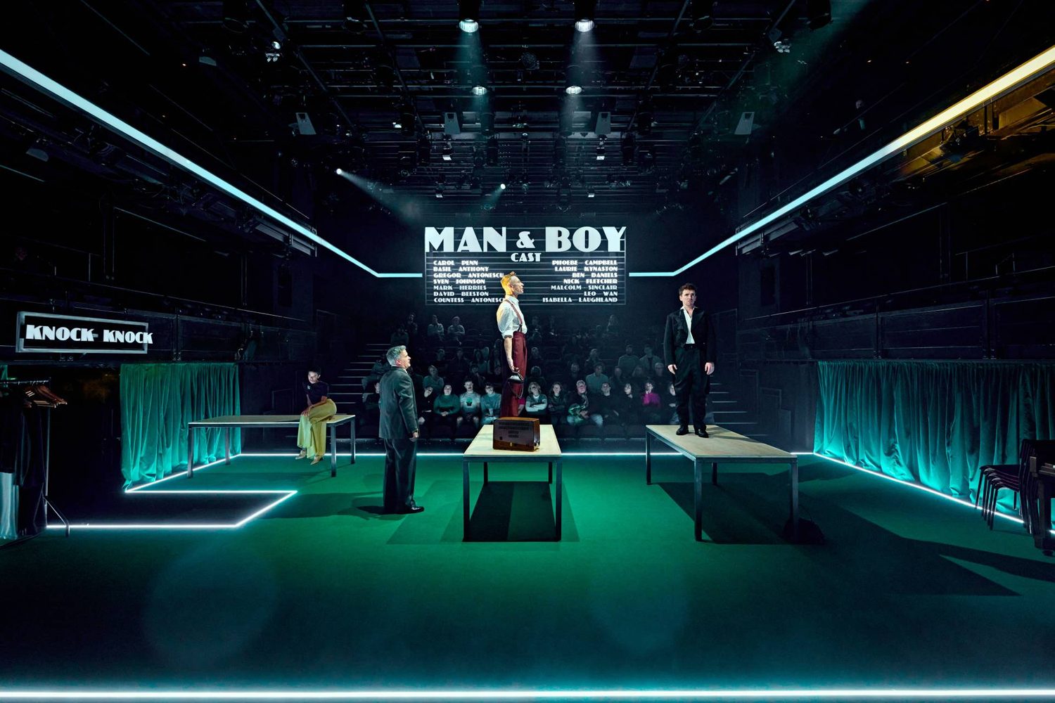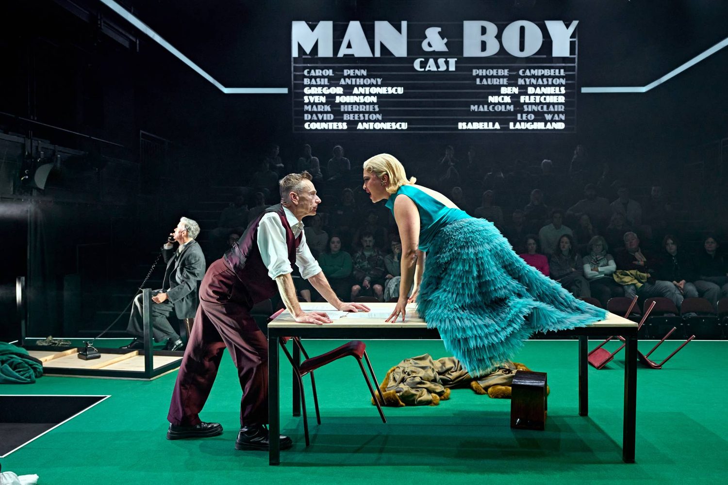 Man and Boy is a rarely performed work by Rattigan, written as his star was waning in the early 1960s following the rise to fame of the “angry young men” such as John Osborne and Arnold Wesker. Unfortunately for Rattigan, plays about lives of quiet desperation lived in a seaside hotel or in rented rooms with one’s unsuitable lover were no longer fashionable. Man and Boy is Rattigan’s attempt to recapture the zeitgeist with a drama set in 1939 about an eastern European plutocrat (based on a real person, apparently) who will stop at nothing to save his business empire from crumbling after a business deal goes awry. In a bid, perhaps, to shake off Rattigan’s somewhat staid image in this new production, the director and stage designer have decided that the traverse stage in the small Dorfman Theatre should be bare apart from Formica tables onto which the actors jump up and down at key points, as well as some 1930s props: a Bakelite phone, a wireless and a decanter of whisky on the sideboard. As the play is set very firmly in its time, with references to the Great Depression and the rise of fascism and Nazism in Europe, the non-naturalistic set just feels strange and distracting.