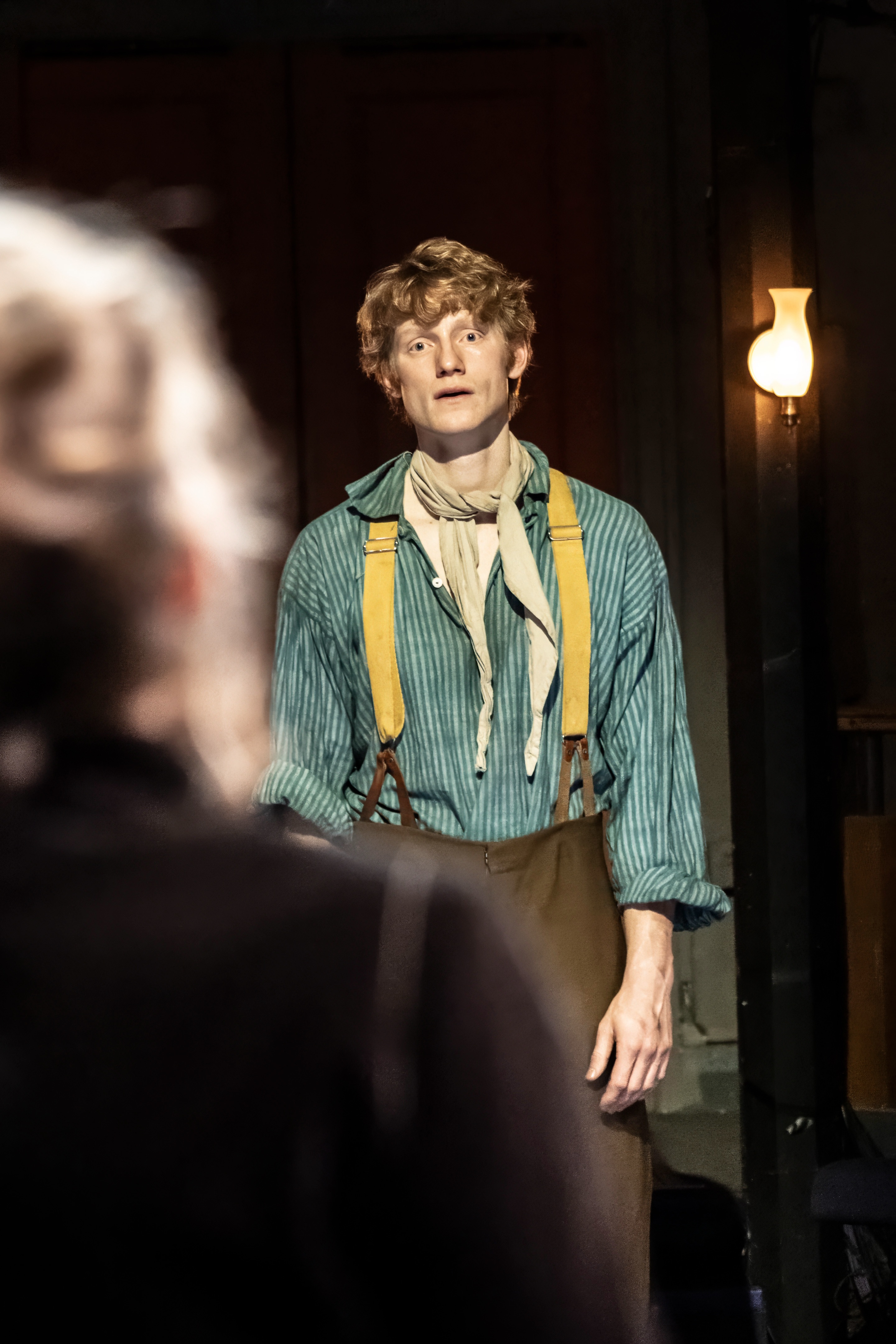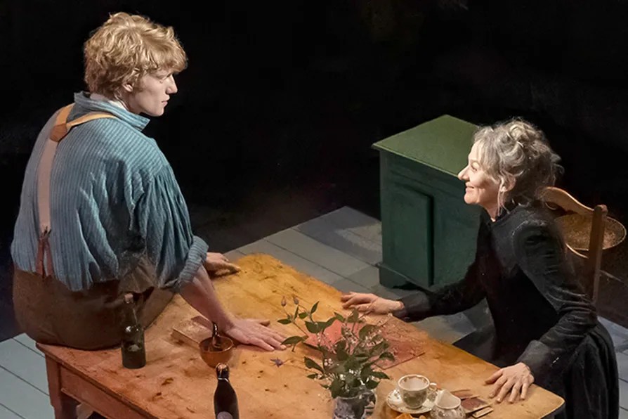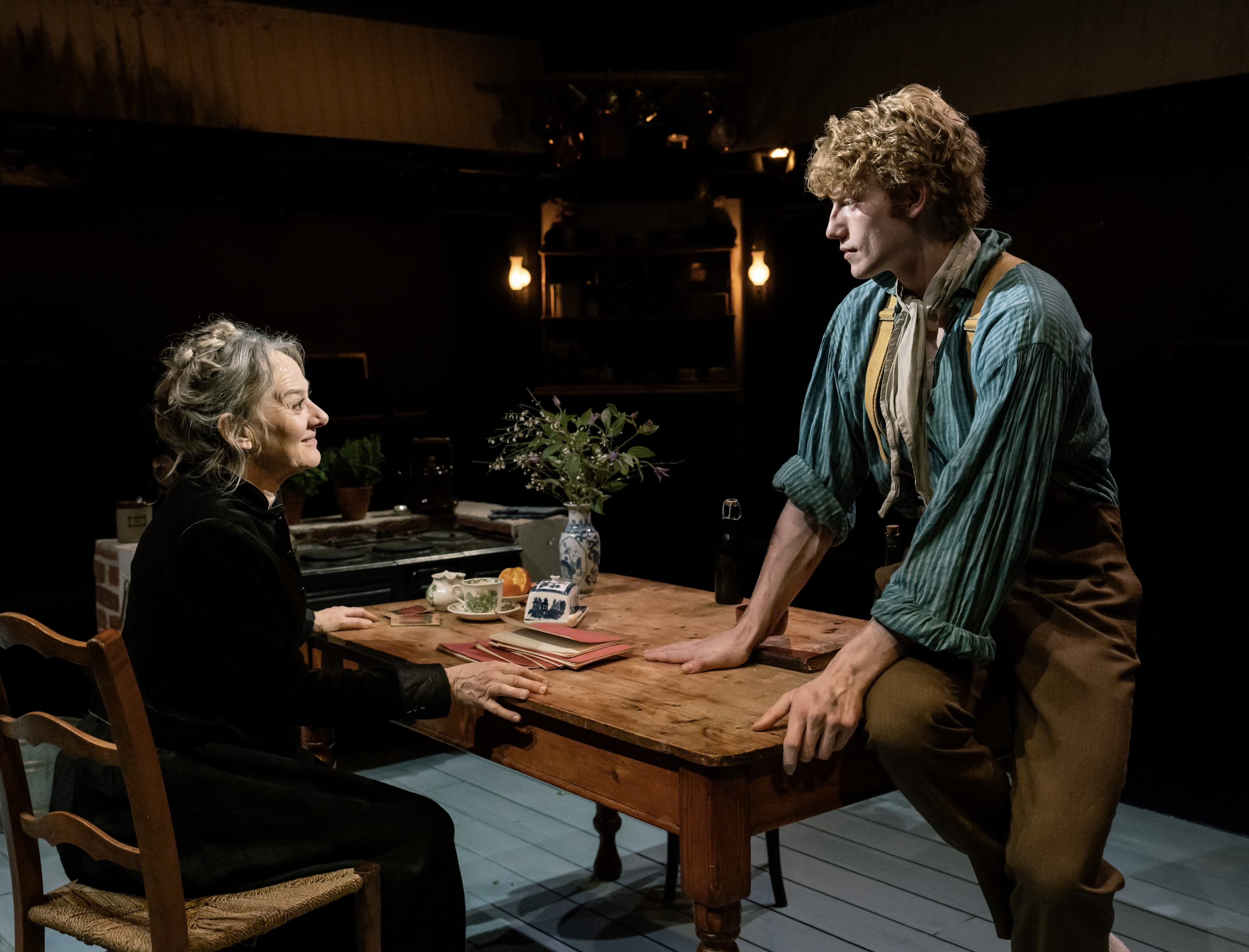 In the play here, we have perfect casting – Niamh Cusack has just the motherly family concerns required for Ursula but with a suppressed warmth waiting to be released; and Jeroen Frank Kales embodies the youthful Vincent with a naivety and upright stance, topped with a clipped Dutch accent and wild ginger hair. In Act 1 the bond between them develops slowly and touchingly, opposites from afar coming together with mutual understanding and encouragement.