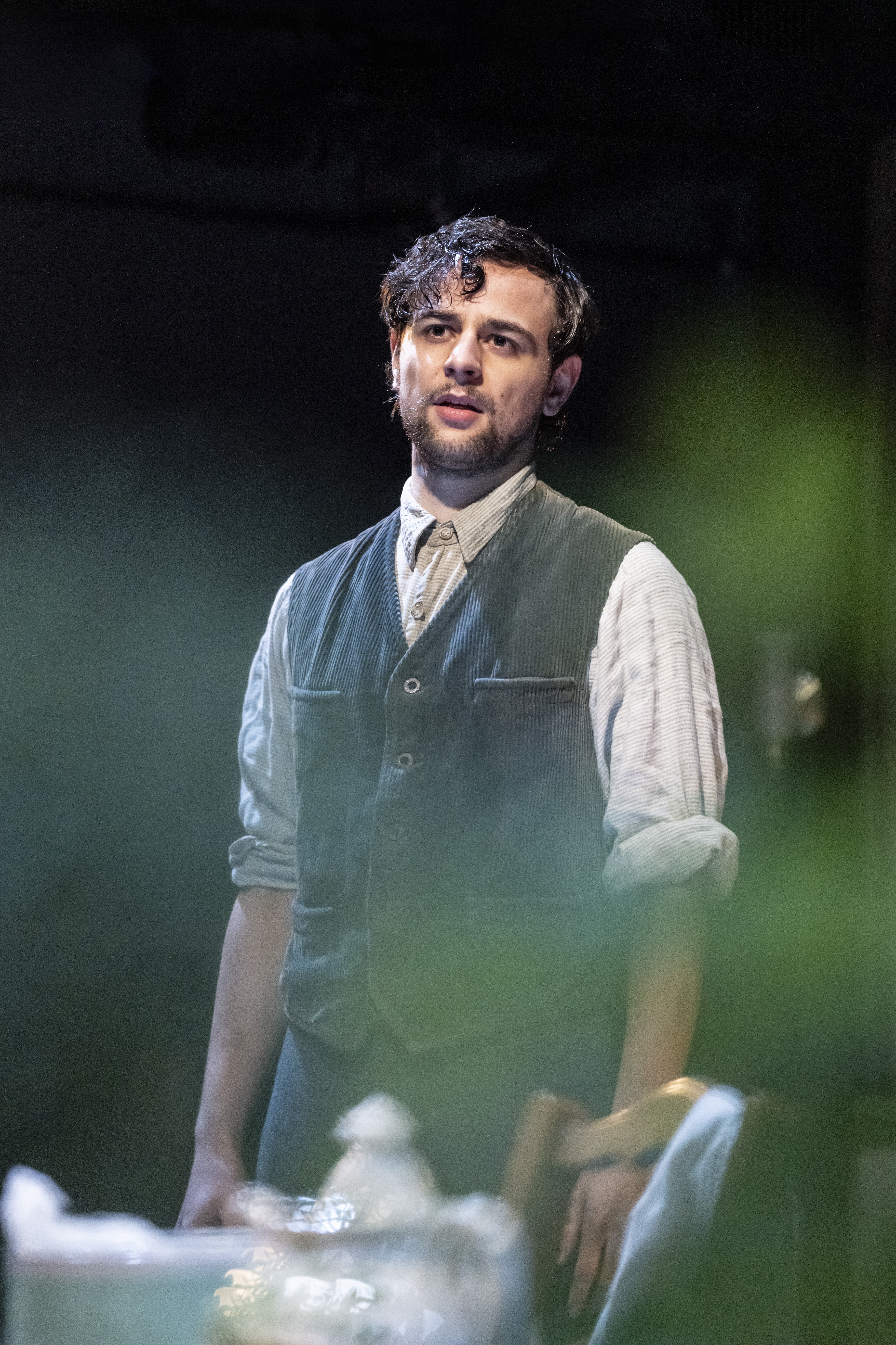 But all praise to the actors and the technical team behind the production, especially to George Blagden who holds our undivided attention throughout, tense for us and exhausting for him. His mostly-monologue of 90 minutes is interrupted only by the assistant and….