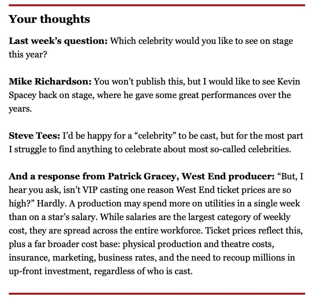 Just Saying.…Each week Clive Davis (of the Times) asks his readers for their thoughts on a topical subject. With theatre prices rising with each new celebrity casting, below was the chosen responses to the previous week’s question. The West End producer’s response is particularly interesting, something we sometimes forget –