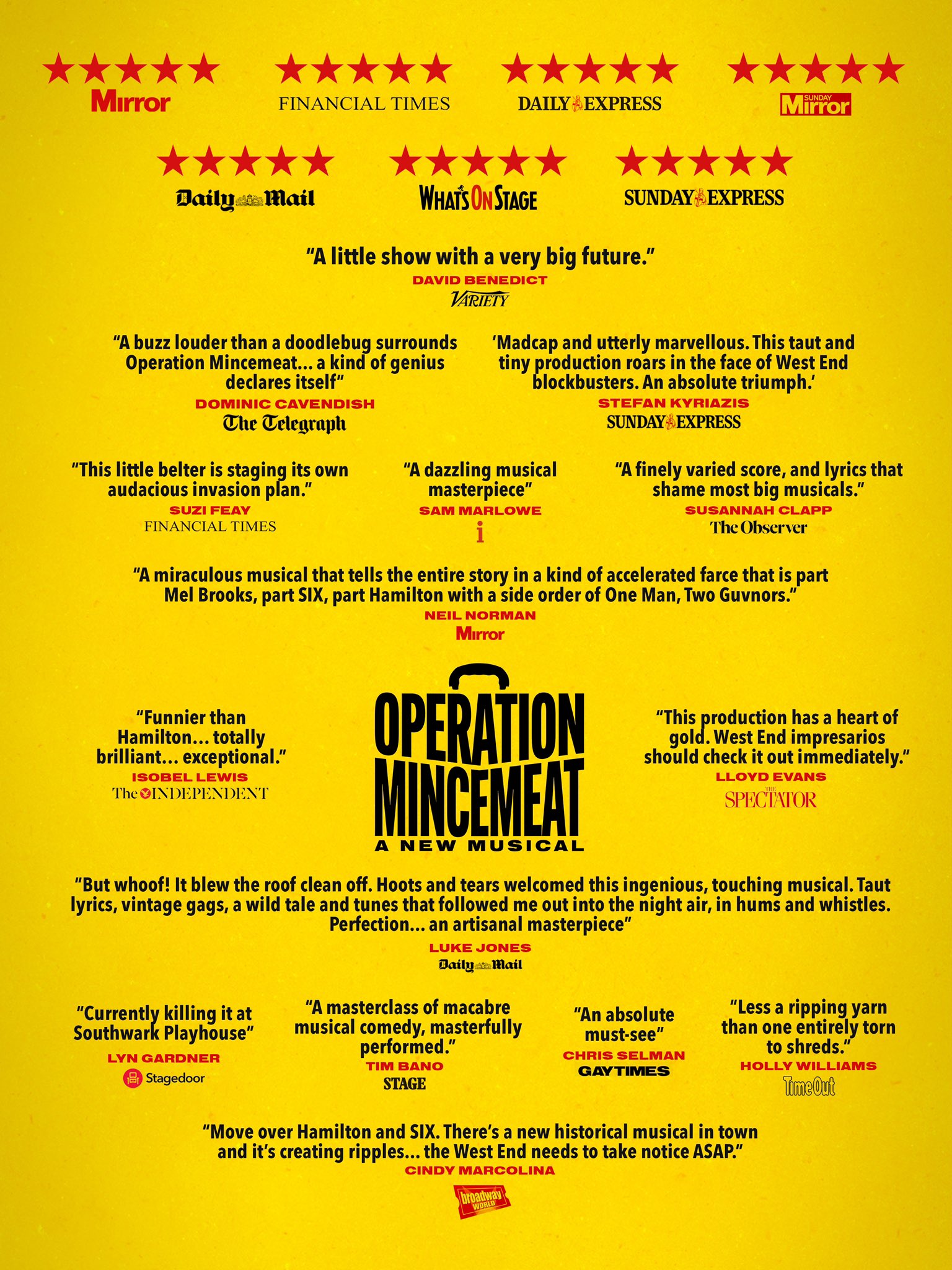 Accuse me if you will of being a bit slow on the uptake, missing the obvious, but honestly until Fredo mentioned it yesterday I did not realise that the ads for ‘Operation Mincemeat’ were meant to represent Hitler. That hair, that moustache, geddit? OK, but Hitler ads have now been replaced by those for new casts, run extensions, merchandise, a Broadway transfer, an impending world tour, etc. Yes Operation Mincemeat is a true phenomenon.