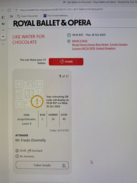 I recently paid for our group visit to the ballet Like Water For Chocolate. I was told that I would get an e-mail with the tickets attached, for me to share with the group. These tickets would only be updated with a necessary QR code 48 hours* before the performance. I explained that I needed to print the tickets in advance as not every member of the group is equipped with a smart phone, and that there were other obstacles (such as, I might be on holiday or not at home when the tickets were sent). My objections were brushed aside, and the e-mail arrived with tickets minus QR codes.