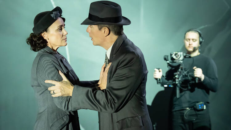 Michael Longhurst, directing with Ann Yee, uses a revolving stage and cameras to bring us closer to the Brief Encounter-style affair conducted by Iris and George. She’s a doctor and would-be Parliamentary candidate, and he’s a louche British actor visiting home from Hollywood (and does anyone do louche as well as Jack Davenport?) When they meet, and as their relationship progresses, we examine their every move projected on to the Donmar’s back wall, with close-ups of the waves of emotion crossing Keeley Hawes’s expressive ace.