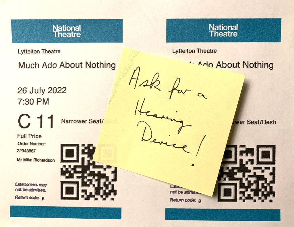 We can look for reasons in us or the theatre, but really it’s not the reasons that matter but the solution to the problem. And there is an obvious solution. I can use a theatre’s free hearing devices. Most theatres have them on request. The National’s gadgets I have found work like magic with distant actors talking right into my ear, better than normal conversation. And so I am adding a sticky note to my theatre tickets to remind me – ask for a hearing device. I may not need it, but if I do it’s there for me and I have no reason to complain afterwards.