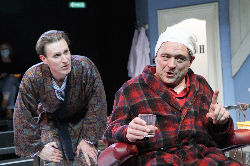 Paul Rider as Harry – wonderfully still, downbeat and waspish – and John Sackville as Charlie – unstoppably verbose, fanciful and fretful – are masterly in their roles, both utterly convincing, their campy dialogue rapidly flicking between bitchiness and affection. The comedic surface sits over something akin to tragedy, with a sense of regrets and of failed, unfulfilled lives. The hermetic atmosphere is strong (we are with them in their basement saloon (set by Alex Marker)). Indeed it serves to make almost credible unexpected revelations in the second half.