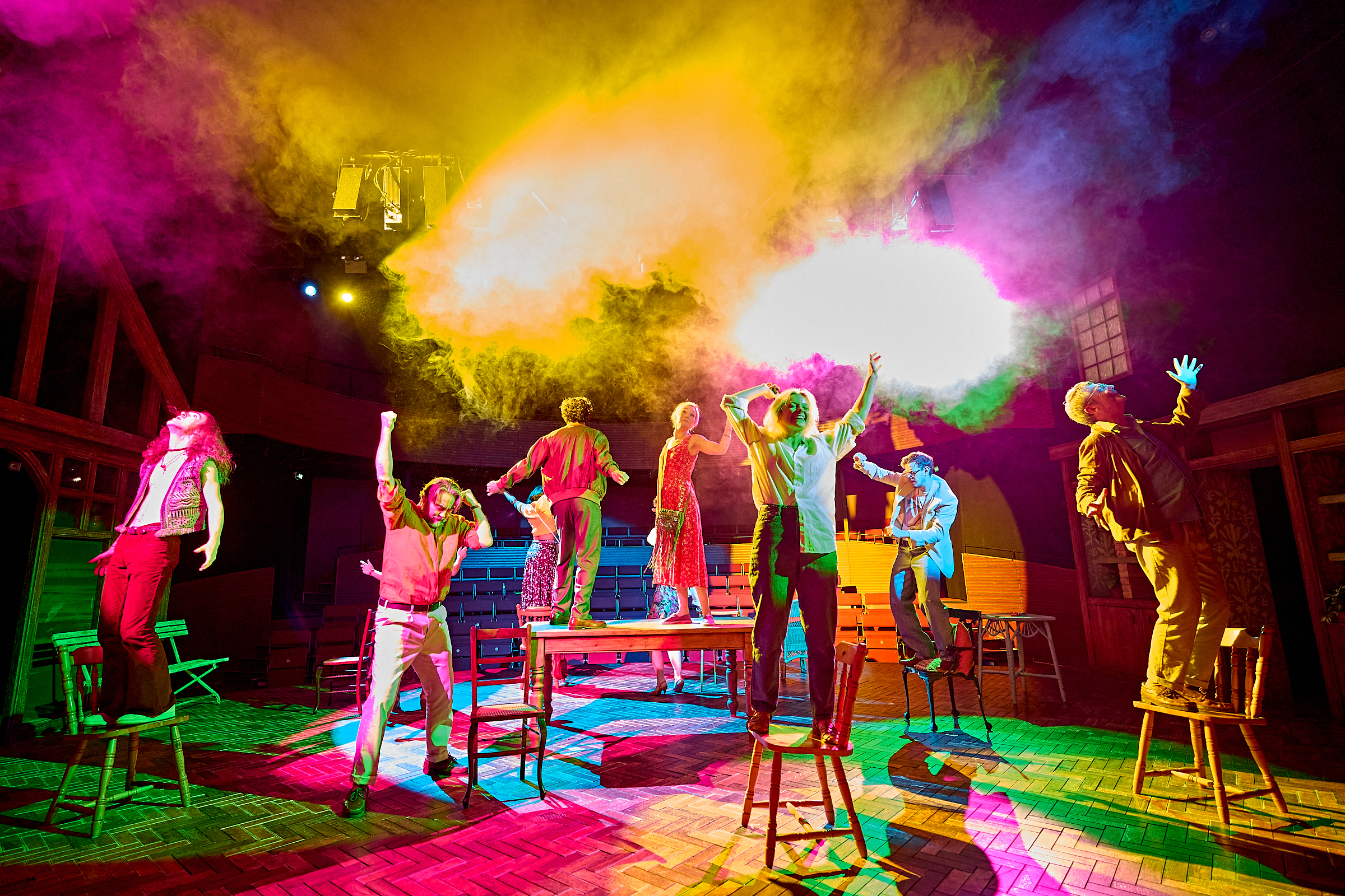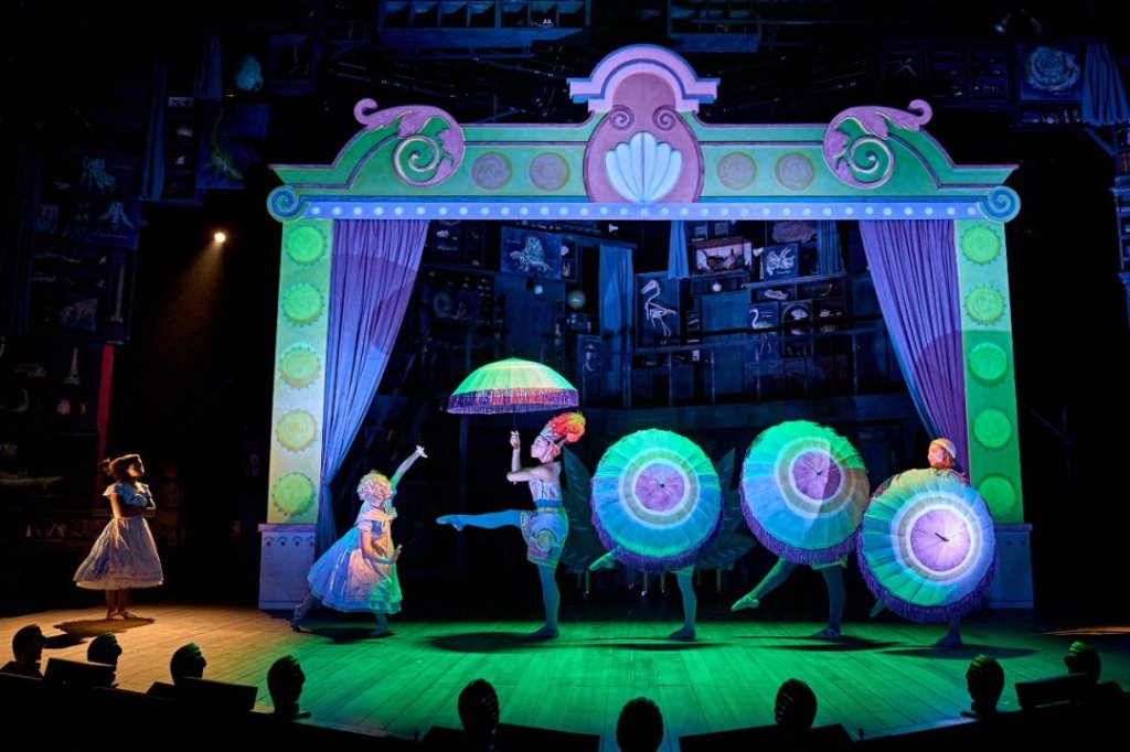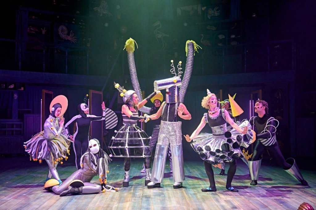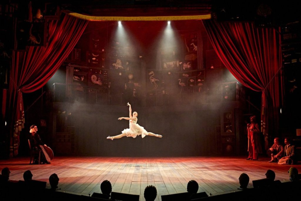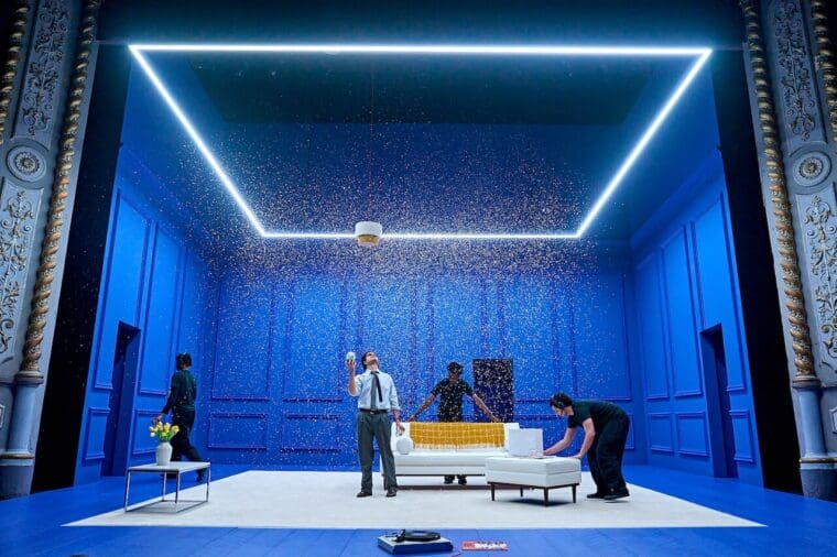 Director Max Webster clearly wants us to know we are watching a play. The set emphasises the acting space with an illuminated surround at both ground and ceiling level, and at one point the very visible stagehands even join the main character in a dance!