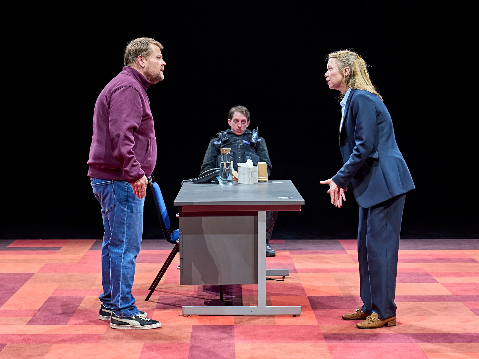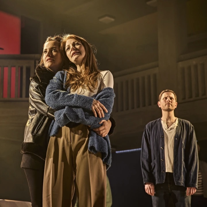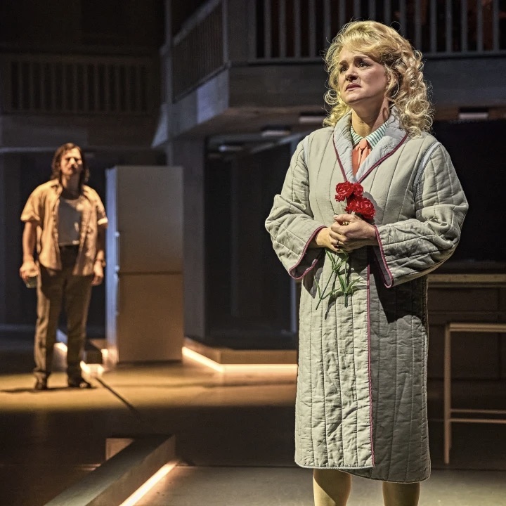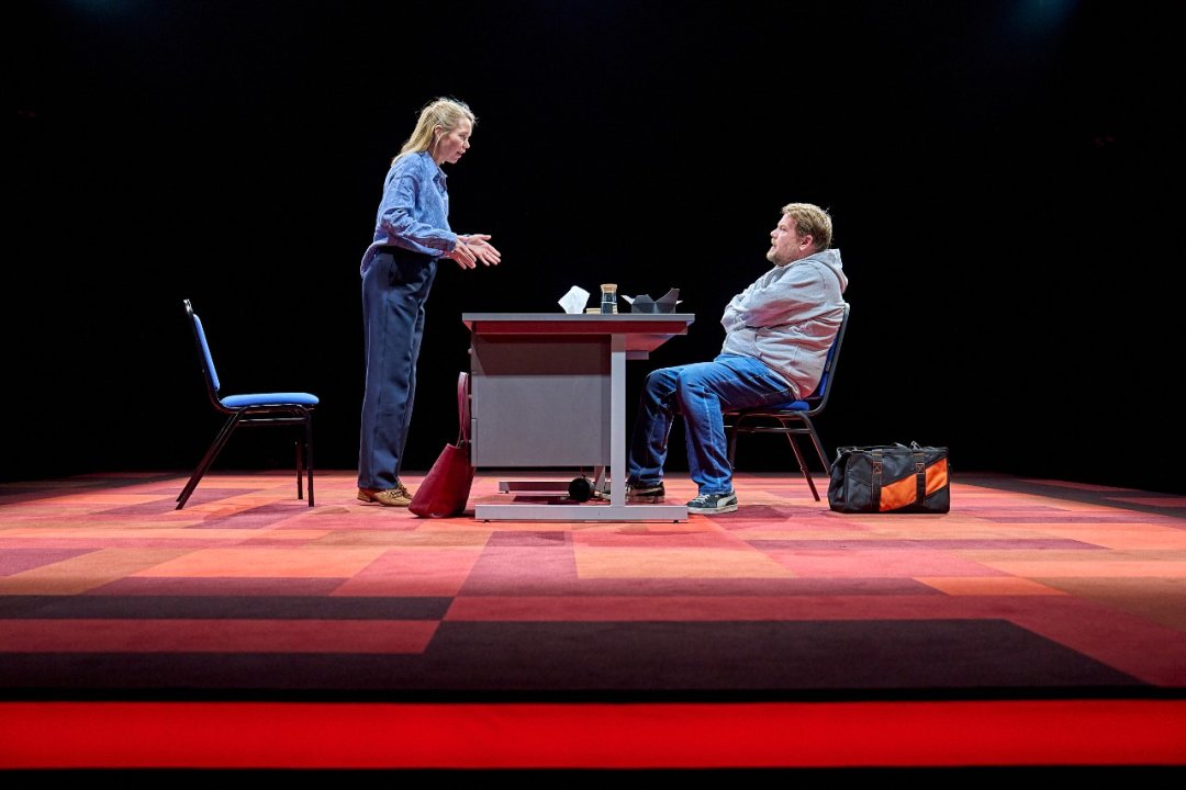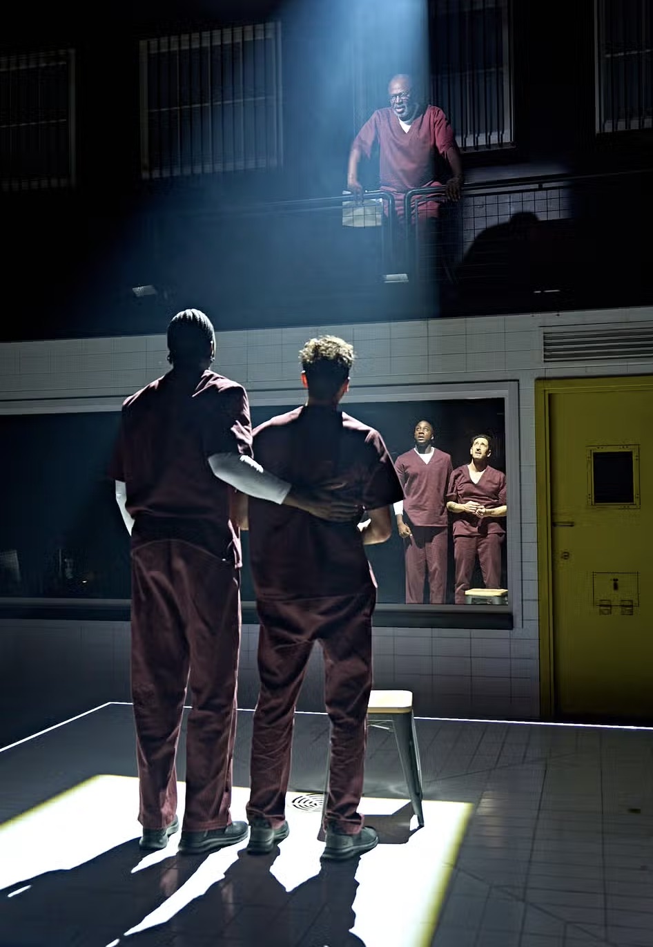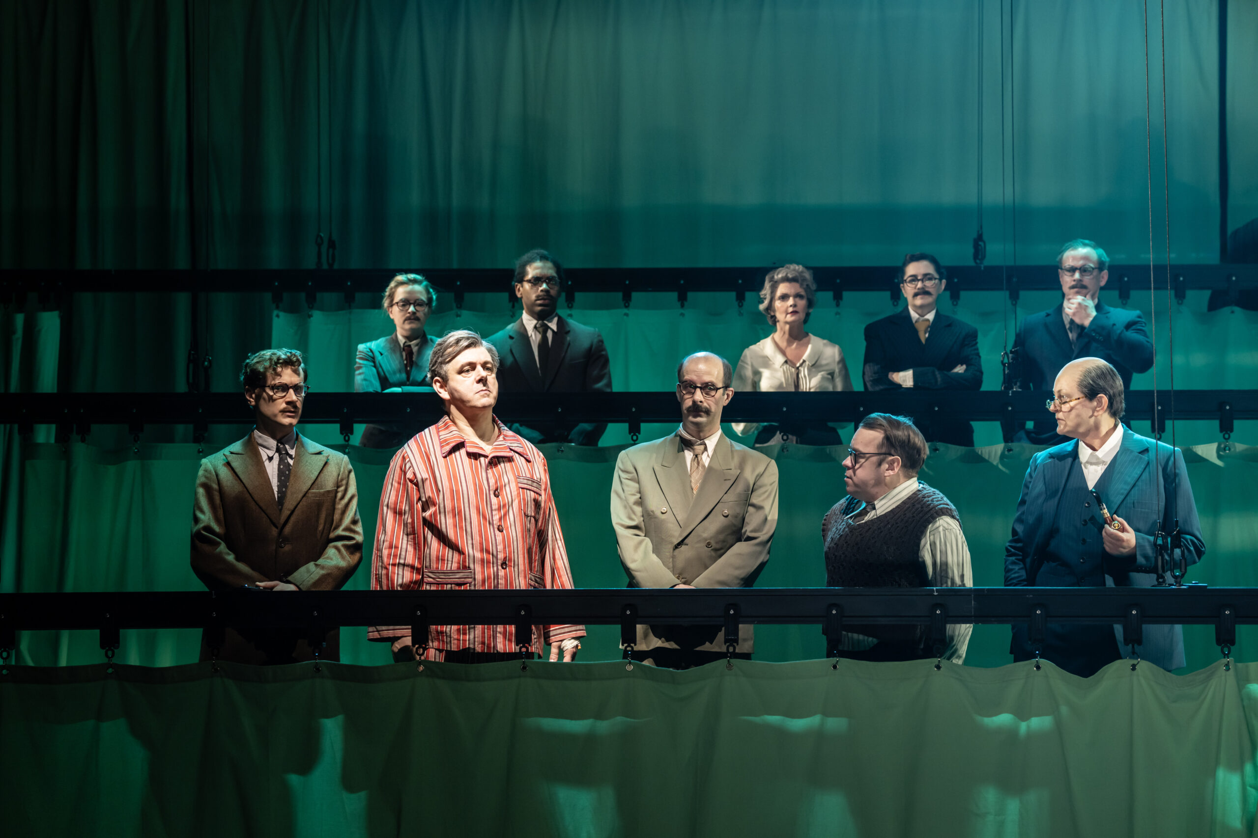 If you were looking for an example of a Gesamtkunstwerk – a “total work of art” which brings together speech, music, architecture, lighting, soundscape etc in one place – you wouldn’t have to trudge off to Bayreuth for a Wagnerian experience – you could come to the Donmar and see this play. As so often, the Donmar has done its marvellous shape-shifting stuff (Miriam Buether set designer) – we are in a wood, we are in prison, we are in a cosy domestic space, we are in court…..