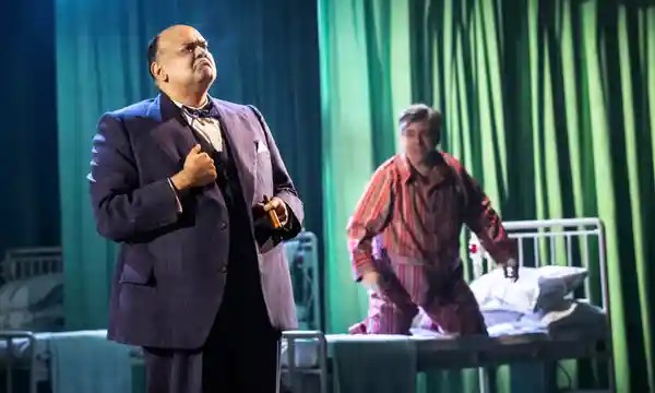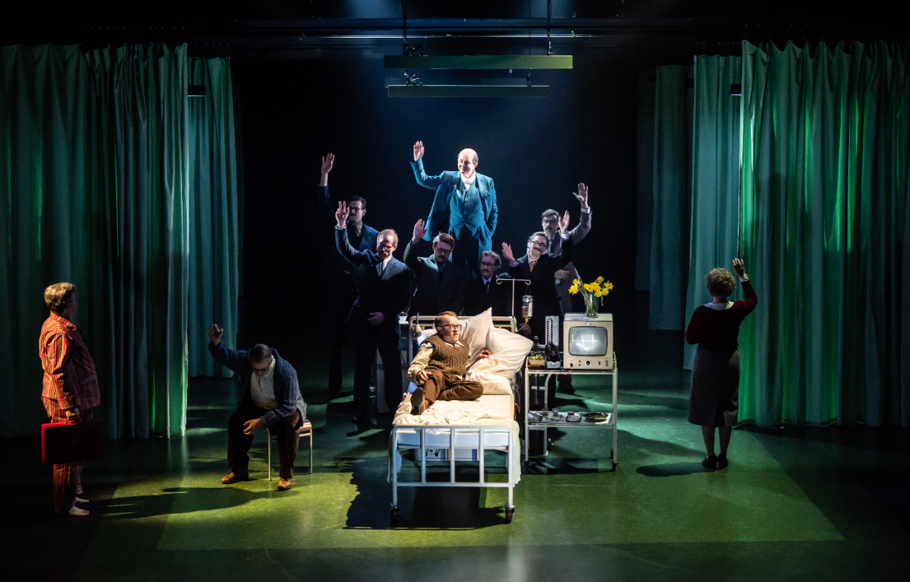 The deceptively minimalistic set is extraordinarily effective. Hospital green is the predominant colour with ECG graphs intermittently flitting across the stage. Institutional beds become in turn a podium , a library and the Chamber in the House of Commons. The use of multi media in the form of faces projected on a screen the width of the stage illustrate the overwhelming objection of the medical profession to the very idea of a national health service.